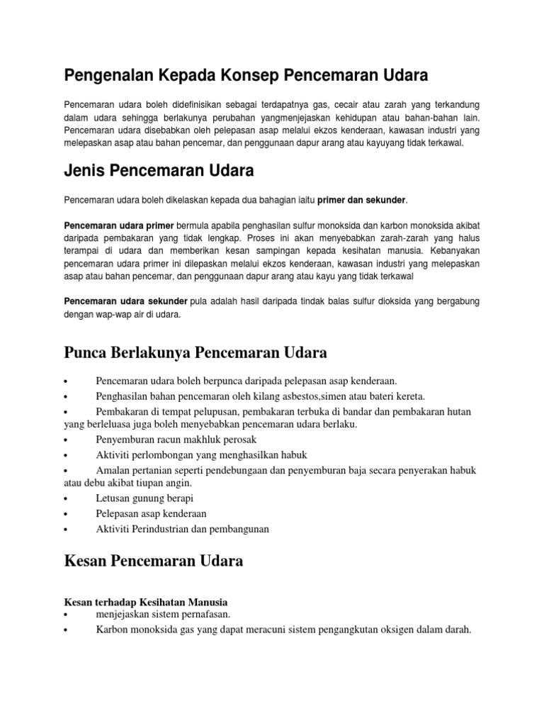 Kebanyakan kilang dibina di sepanjang sungai untuk memastikan. Punca atau pencemaraan udara itu adalah asap asap yg tebuat dr pembakaraan terbuka. Ittv spm tingkatan 5 sains bab 5 gerakan (prinsip bernoulli : Kenderaan bermotor merupakan punca utama kepada isu pencemaran udara di bandaraya kuala lumpur (1 markah). Pencemaran udara adalah kehadiran satu atau lebih substansi fisik, kimia, atau biologi di atmosfer dalam jumlah yang dapat membahayakan kesehatan manusia, hewan, dan tumbuhan, mengganggu estetika dan kenyamanan, atau merusak properti.