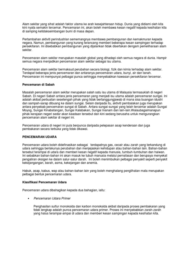 Pencemaran Udara Selena from image.slidesharecdn.com Pencemaran udara berpunca daripada pelepasan asap kotor oleh industri terus ke udara melalui cerobong asap kilang, kenderaan motor di jalan raya dan letusan gunung berapi. Di dalam sektor pengangkutan, kenderaan motor adalah penyumbang utama kepada pencemaran udara. Pencemaran udara adalah kehadiran satu atau lebih substansi fisik, kimia, atau biologi di atmosfer dalam jumlah yang dapat membahayakan kesehatan manusia, hewan, dan tumbuhan, mengganggu estetika dan kenyamanan, atau merusak properti. Ittv spm tingkatan 5 sains bab 5 gerakan (prinsip bernoulli : Punca pencemaran secara umumnya pencemaran boleh berpunca daripada alam semulajadi asap kenderaan. Pencemaran udara disebabkan oleh pelepasan asap melalui ekzos kenderaan, kawasan industri yang melepaskan asap atau bahan pencemar, dan penggunaan dapur arang atau kayu yang tidak terkawal. Pencemaran udara boleh dikelaskan kepada dua bahagian iaitu primer dan sekunder. Antara kesan pencemaran udara adalah penipisan lapisan ozon, jerebu, hujan asid dan pemanasan bumi.