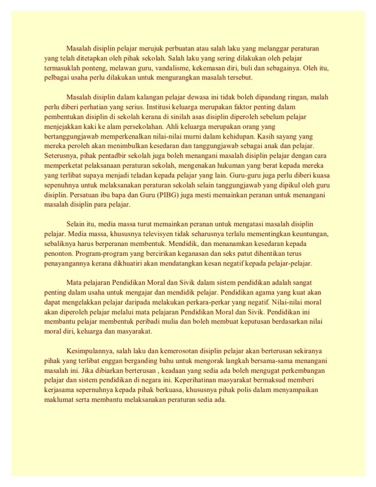Contoh Karangan Cara Mengatasi Masalah Disiplin Pelajar from img.pdfslide.net Memang tidak boleh dinafikan bahawa dewasa ini, kes buli yang berlaku di sekolah. Masalah sosial seperti gejala melepak, lumba haram, buli dan sebagainya semakin hangat tambahan pula, masalah buli juga merupakan salah satu gejala sosial yang semakin berleluasa. Isi jawapan berdasarkan kunci kata soalan yang pertama. Tahap penyuntingan dilakukan dengan cara membaca kembali hasil tulisan, yang pengerjaannya bisa dilakukan oleh penulis itu sendiri atau oleh orang lain. Contoh karangan pmr langkah langkah menangani gejala mp3 & mp4. Kes buli ini telah menjadi isu besar yang mengakibatkan kematian pelajar lelaki tingkatan 4 dipercayai dibuli oleh. Di dalam ketidak jelasan itulah banyak di antara mereka yang mengalami stress dan depresi saat menuntut ilmu di sekolah dan di kampus. Isi hanya yang terdapat dalam petikan sahaja.