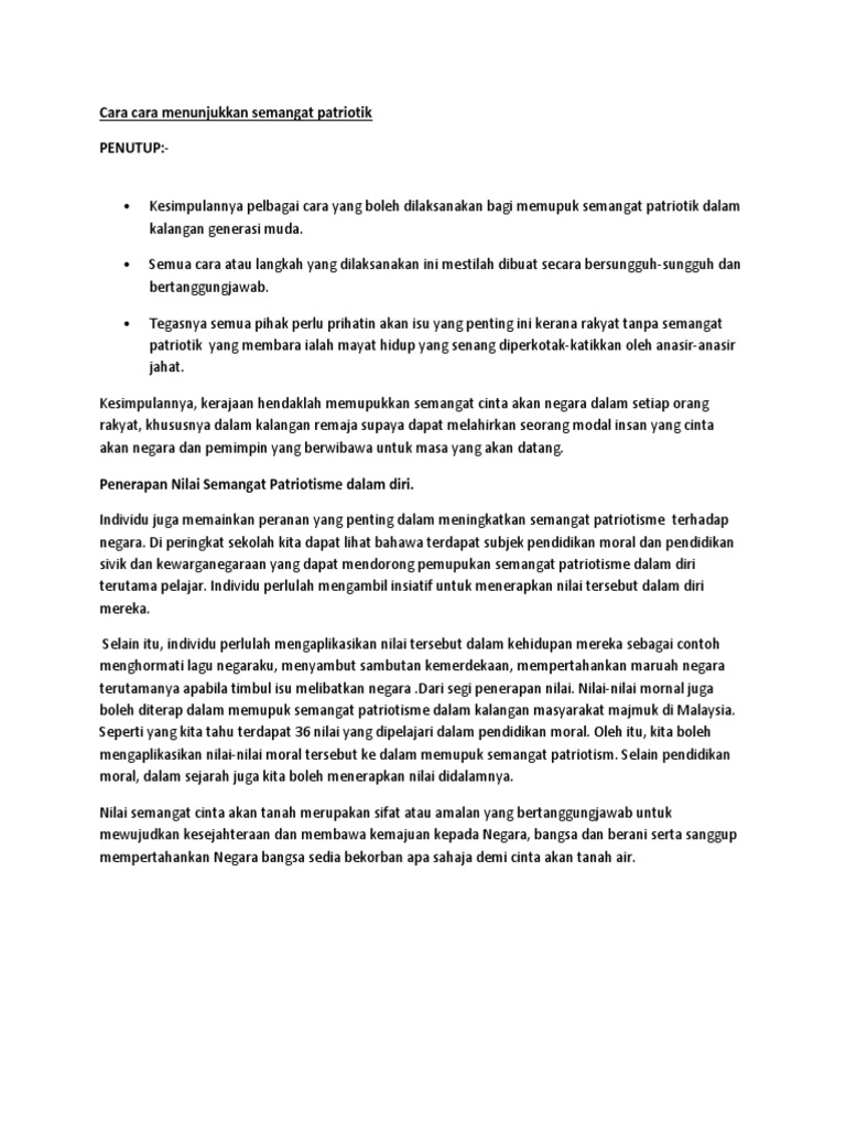 Hal ini demikian berpunca daripada pelbagai faktor dan suasana kehidupan yang lebih terbuka dan mencabar. Ulasan cara menunjukkan semangat patriotik youtube. Langkah memupuk semangat patriotik murid menulis karangan berdasarkan kerangka karangan di bawah ini. Pada sambutan ini, pihak sekolah boleh mengadakan pelbagai program seperti pertandingan nyanyian lagu patriotik. Mengadakan program sambutan 'bulan kemerdekaan' di. Bersikap patriotik dan sayangkan negara. Semangat patriotik dapat disimpulkan sebagai roh atau kumpulan orang yang mempunyai pendapat yang sama kerajaan memupuk patriotisme rasmi yang penuh isi simbolik dan istiadatnya. Memupuk kasih sayang di antara anggota masyarakat. Anak yang baik dan terdidik adalah yang datang daripada ibu bapa. Adakah betul cara segelintir remaja yang menyambut kemerdekaan dari petang, tengah malam hingga dinihari? Dewasa ini, golongan remaja dikatakan kurang mempunyai semangat patriotik. Cara pertama untuk memupuk semangat patriotisme ialah ibu bapa perlu memainkan peranan. Langkah memupuk semangat patriotik dalam.